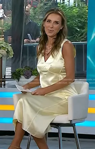 on Today on NBC was spotted wearing this yellow satin dress on Today on Jul 10 2025's episode. 's Dress is the Deconstructed Satin Slip Midi Dress in Pale Yellow by Club Monaco.