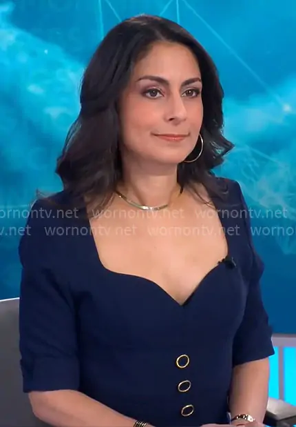 Dr. Celine Gounder on CBS Mornings on CBS was spotted wearing this navy button detail dress on CBS Mornings on Dec 18 2025's episode. Celine's Dress is the Kerry Sheath in Pacific Blue by Black Halo .