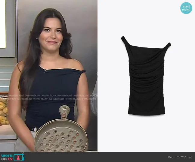 on Today on NBC was spotted wearing this black twisted strap top on Today on Jul 14 2025's episode. 's Top is the Twisted Strap Top by Zara.