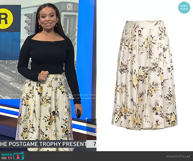 Adelle Caballero on Today on NBC was spotted wearing this ivory floral print skirt on Today on Jul 14 2025's episode. Adelle's Skirt is the Drip Bouquet Silk Pleated Midi-Skirt by Tory Burch.
