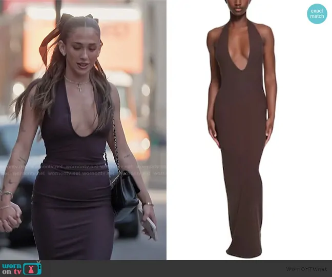 Ariana Biermann on Next Gen NYC on Bravo was spotted wearing this burgundy halter dress on Next Gen NYC on episode 'Welcome to New York' (1x01) in Jun 2025. Ariana's Dress is the Halter Neck Stretch Dress by Skims.