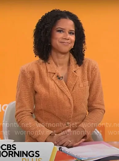 Adriana Diaz on CBS Mornings on CBS was spotted wearing this orange textured suit on CBS Mornings on Nov 27 2024's episode. Adriana's Jacket is the Next Date Blazer by Blank NYC . Adriana's Pants is the Next Date Trousers by Blank NYC .