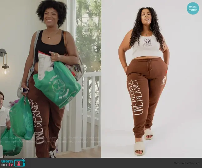 Riley Burruss on Next Gen NYC on Bravo was spotted wearing this brown sweatpants on Next Gen NYC on episode 'Boardwalk of Shame' (1x06) in Jul 2025. Riley's Pants is the One People One Planet Sweatpants by Chnge.