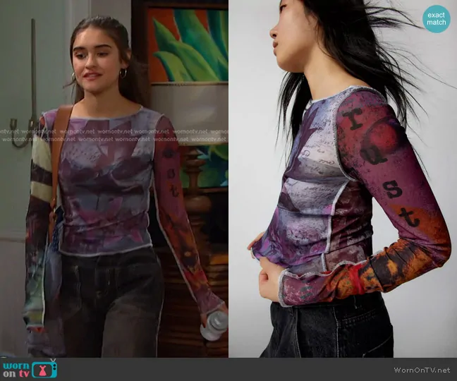 Arianna Horton (played by Marissa Reyes) on Days of our Lives on Peacock was spotted wearing this print mesh top on Days of our Lives on Jul 23 2025's episode. Ari's Top is the Floral Mesh Long Sleeve Tee by Urban Outfitters . Ari's Pants is the Palmer Cuffed Baggy Jeans In Chalkboard by We The Free.