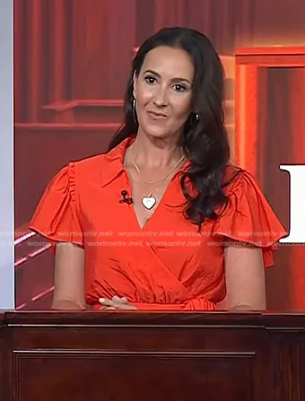 on Today on NBC was spotted wearing this red wrap mini dress on Today on Jul 22 2025's episode. 's Dress is the Lila Asymmetric Ruffle Taffeta Minidress in Cherry Tomato by Cinq a Sept.