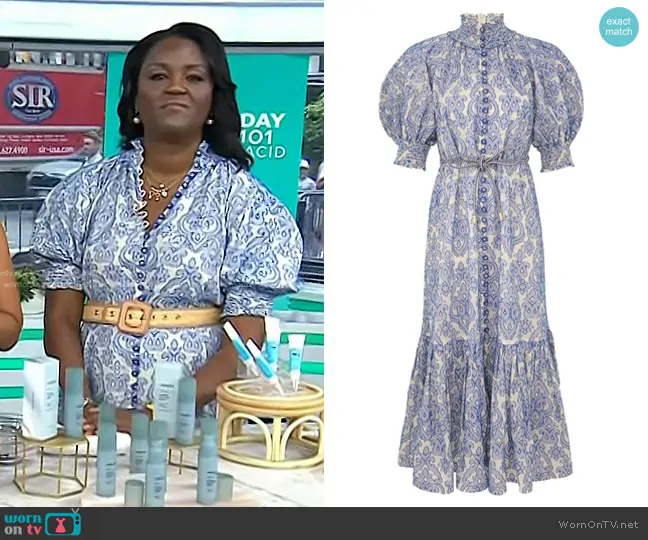on Today on NBC was spotted wearing this blue print puff sleeve dress on Today on Jul 23 2025's episode. 's Dress is the Wylie Lantern Cotton Midi-Dress in Blue by Zimmermann.