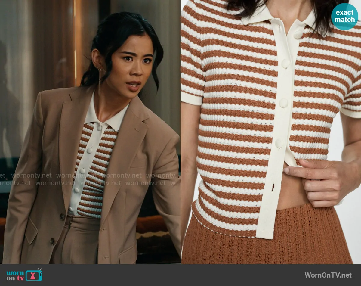Sarah Franklin (played by Leah Lewis) on Matlock on CBS was spotted wearing this camel suit and striped knit top on Matlock on episode 'The Johnson Case' (1x16) in Apr 2025. Sarah's Top is the Stripe Short Sleeve Knit Button-Up Shirt by Mango . Sarah's Jacket is the Wool Blend Blazer in Camel by Polo Ralph Lauren . Sarah's Pants is the Wool Pleated Wide-Leg Pants in Camel by Polo Ralph Lauren.