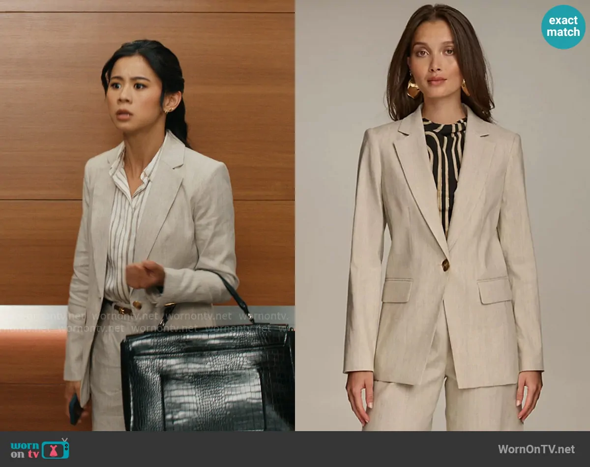 Sarah Franklin (played by Leah Lewis) on Matlock on CBS was spotted wearing this linen blazer with gold buttons on Matlock on episode 'The Johnson Case' (1x16) in Apr 2025. Sarah's Jacket is the One-Button Long-Sleeve Blazer by Donna Karan.