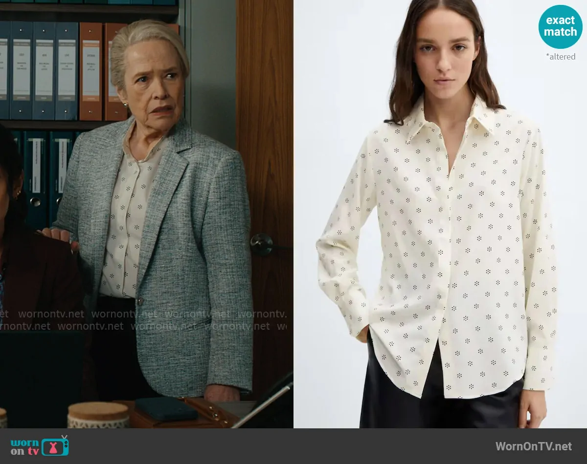 Madeline Matlock (played by Kathy Bates) on Matlock on CBS was spotted wearing this grey tweed blazer and printed shirt on Matlock on episode 'The Johnson Case' (1x16) in Apr 2025. Madeline's Top is the Regular Flowy Shirt in Vanilla by Mango . Madeline's Jacket is the One Button Notch Collar Jacket by Anne Taylor.