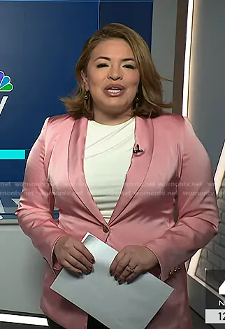 Gilma Avalos on NBC News Daily on NBC was spotted wearing this pink satin blazer on NBC News Daily on Jan 06 2026's episode. Gilma's Jacket is the Satin One-Button Jacket by Donna Karan.
