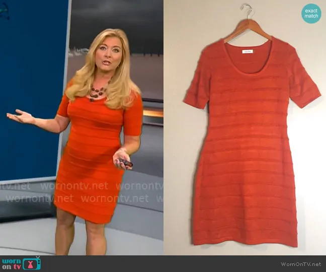 Kelly Cass on CBS Mornings on CBS was spotted wearing this orange bandage dress on CBS Mornings on Oct 12 2022's episode. Kelly C's Dress is the Sweater Bandage Dress by Calvin Klein .