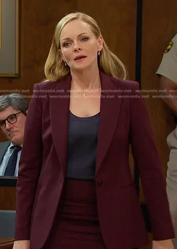 Belle Brady (played by Martha Madison) on Days of our Lives on Peacock was spotted wearing this burgundy blazer and skirt set on Days of our Lives on Jul 25 2025's episode. Belle's Jacket is the Jade Single Breasted Blazer in Berry by Reiss . Belle's Skirt is the Jade Tailored Skirt in Berry by Reiss.