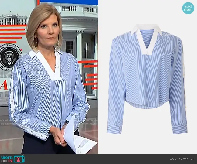 Kate Snow on NBC News Daily on NBC was spotted wearing this blue stripe v-neck shirts on NBC News Daily on Jul 30 2025's episode. Kate's Top is the Woven Polo With Button Detail by Naadam.