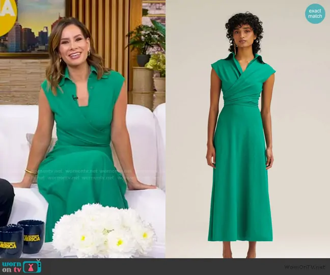 Rebecca Jarvis on Good Morning America on ABC was spotted wearing this green wrap top and dress on Good Morning America on Nov 28 2025's episode. Rebecca's Top is the Crepe Knit Wrap Shirt by Scanlan Theodore . Rebecca's Dress is the Crepe Knit Strapping Dress by Scanlan Theodore.