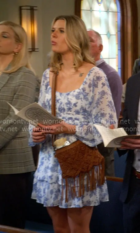 Josie Murphy (played by Hannah Pilkes) on Leanne on Netlfix was spotted wearing this blue floral dress on Leanne on episode 'Chipmunk in the Drywall' (1x09) in Aug 2025. Josie's Dress is the Floral Print Chiffon Blouson-Sleeve Fit & Flare Dress by Trixxi . Josie's Bag is the Western Heritage Woven Leather Fringe Crossbody Bag by Shyanne.