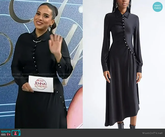 on Today on NBC was spotted wearing this black asymmetric button shirtdress on Today on Aug 04 2025's episode. 's Dress is the Long Sleeve Draped Jersey Midi Dress by Rabanne.