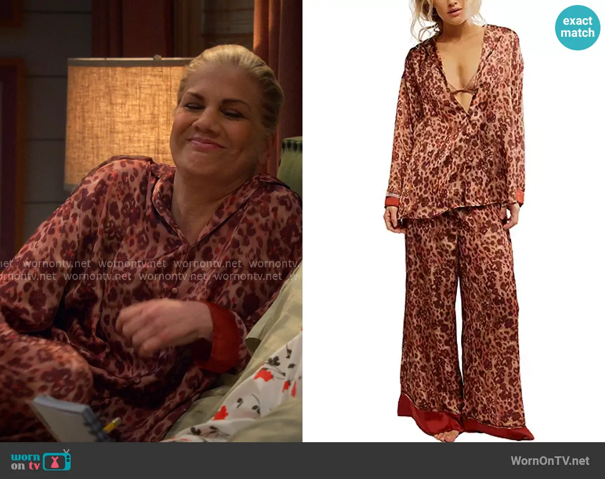 Carol (played by Kristen Johnston) on Leanne on Netlfix was spotted wearing this orange leopard print pajamas on Leanne on episode 'Don't Dangle a Dream' (1x13) in Aug 2025. Carol's Pajamas is the Dreamy Days Pajama Set in Dreamy Leopard Combo by Free People . Carol's Slippers is the Coquette Shearling Lined Slipper in Black by Ugg.