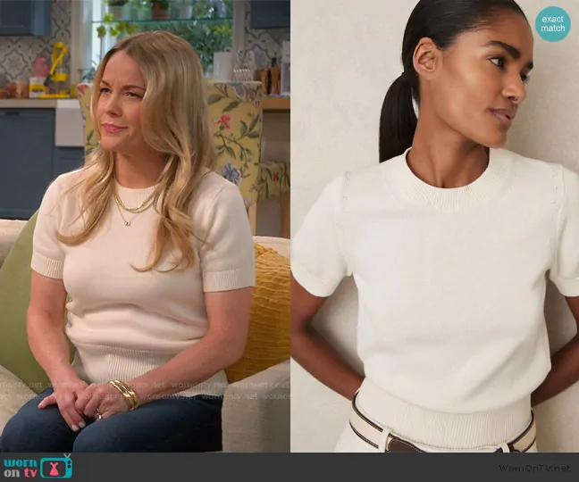Becca (played by Andrea Anders) on Leanne on Netlfix was spotted wearing this Becca’s white short sleeve knit top on Leanne on episode 'Gomez Is a Woman' (1x14) in Aug 2025. 's Top is the Anita Knit Crewneck Top by Reiss.