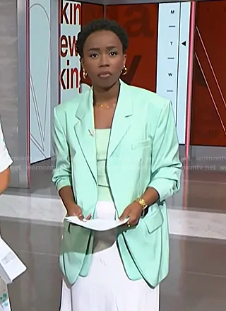 Zinhle Essamuah on NBC News Daily on NBC was spotted wearing this mint green layered blazer on NBC News Daily on Aug 05 2025's episode. Zinhle's Jacket is the Jaleda Tailored Blazer by Boss.