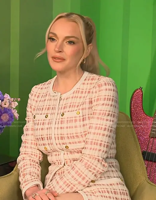 on Access Hollywood on NBC was spotted wearing this pink tweed mini dress on Access Hollywood on Aug 07 2025's episode. 's Dress is the Tailored Cotton Boucle Jacket by Giambattista Valli.