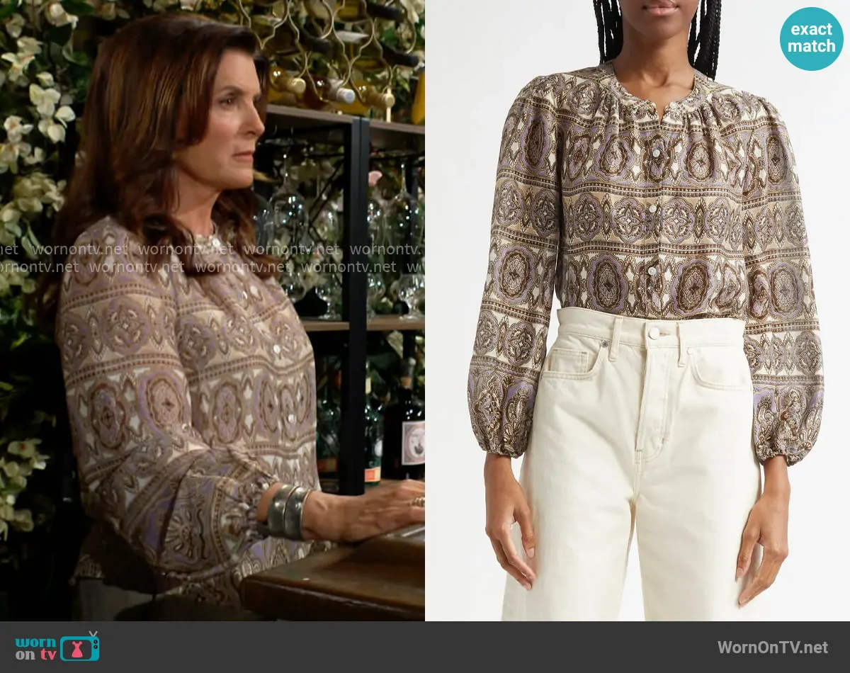 Sheila Carter (played by Kimberlin Brown) on The Bold and the Beautiful on CBS was spotted wearing this beige printed blouse on The Bold and the Beautiful on Aug 07 2025's episode. Sheila's Top is the Ashlynn Blouse in Stone Khaki Multi by Veronica Beard .