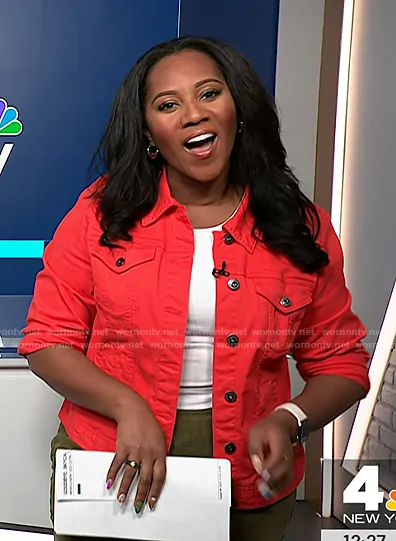 Kay Angrum on NBC News Daily on NBC was spotted wearing this red denim jacket on NBC News Daily on Aug 08 2025's episode. Kay's Jacket is the Denim Jacket in Red Harbour by New York & Company.