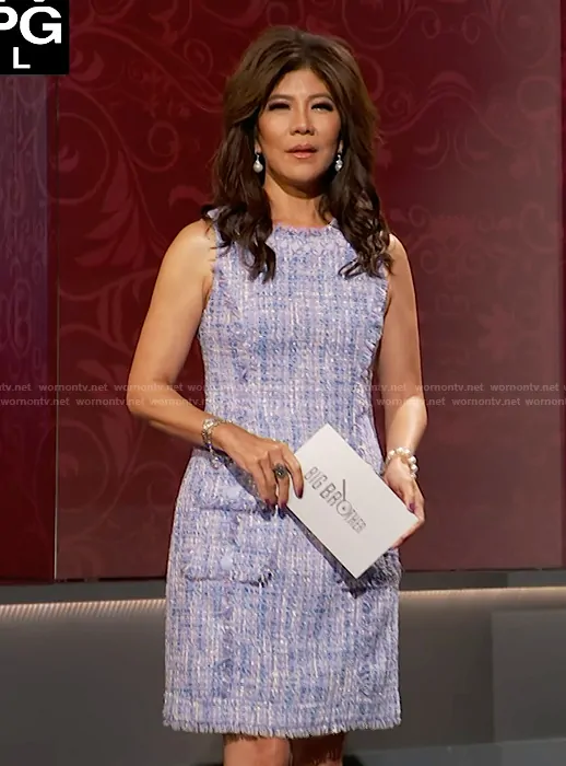 Julie Chen on Big Brother on CBS was spotted wearing this blue tweed mini dress on Big Brother on Aug 11 2025's episode. Julie's Dress is the Lucie Boucle Ellisel Dress by Cinq a Sept.