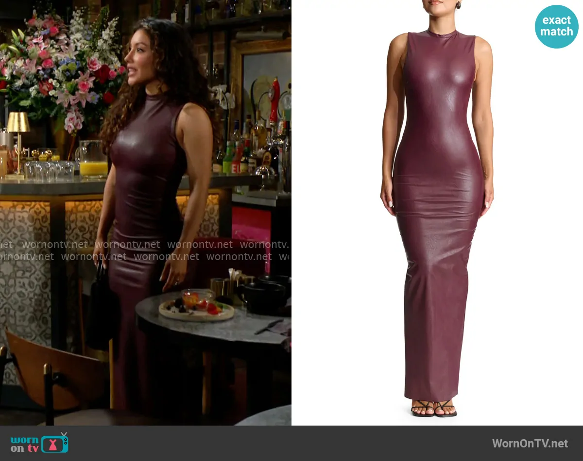 Audra Charles (played by Zuleyka Silver) on The Young and the Restless on CBS was spotted wearing this burgundy leather maxi dress on The Young and the Restless on Aug 11 2025's episode. Audra's Dress is the Liquid Faux Suede All Faux Love Maxi Dress in Dark Plum by Naked Wardrobe .