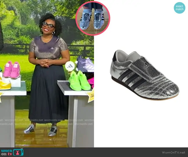 on Good Morning America on ABC was spotted wearing this lurex tee and silver sneakers on Good Morning America on Aug 11 2025's episode. 's Top is the Vintage Spring Summer 1998 Lurex Top by Vivienne Westwood . 's Shoes is the Taekwondo Sneaker by Adidas.