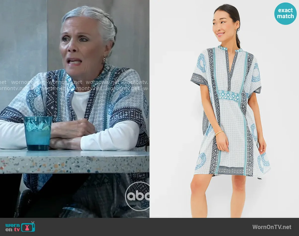 Tracy Quartermaine (played by Jane Elliot) on General Hospital on ABC was spotted wearing this blue printed tunic top on General Hospital on Aug 11 2025's episode. Tracy's Dress is the Cerulean Emerson Short Caftan by Love Tomas by Emerson Fry .
