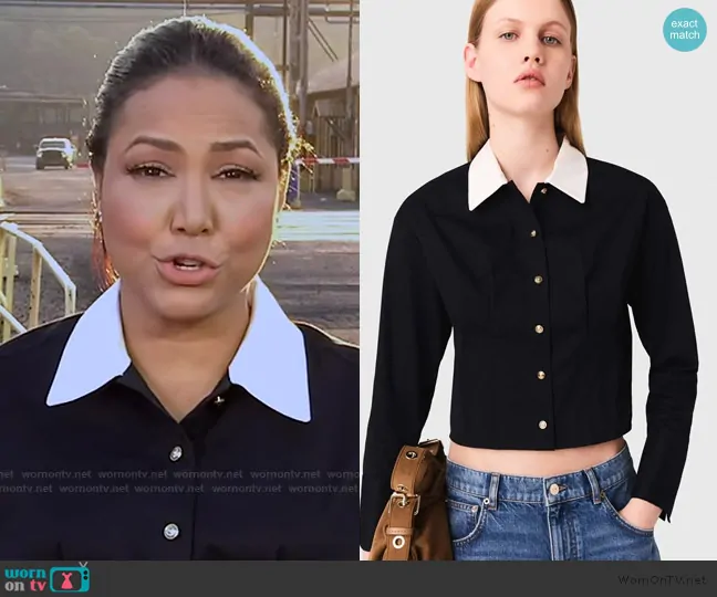 Stephanie Ramos on Good Morning America on ABC was spotted wearing this contrast collar Top on Good Morning America on Aug 12 2025's episode. Stephanie's Top is the Cropped poplin shirt by Maje.