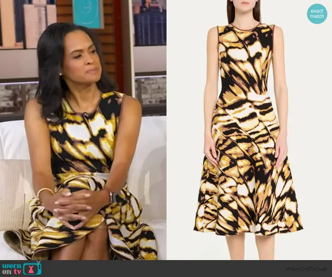 Linsey Davis on Good Morning America on ABC was spotted wearing this butterfly print sleeveless dress on Good Morning America on Aug 12 2025's episode. Linsey's Dress is the Butterfly Jacquard-Knit Crewneck Midi-Dress by Oscar de la Renta.