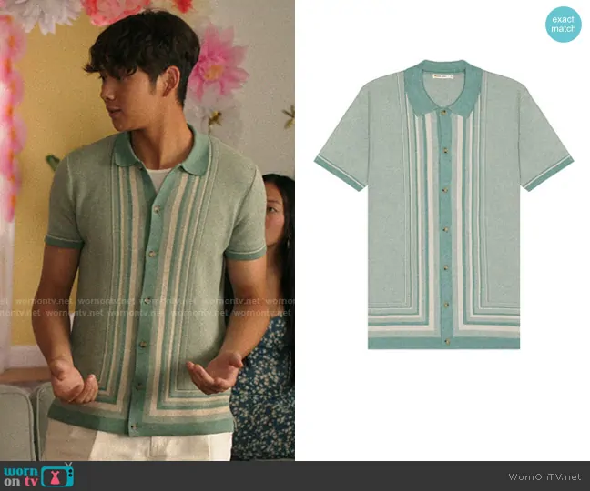 Steven (played by Sean Kaufman) on The Summer I Turned Pretty on Amazon Prime was spotted wearing this green stripe shirt on The Summer I Turned Pretty on episode 'Last Name' (3x06) in Aug 2025. Steve's Sweater is the Border Stripe Short Sleeve Sweater in Deep Sea & Oatmeal by Marine Layer.