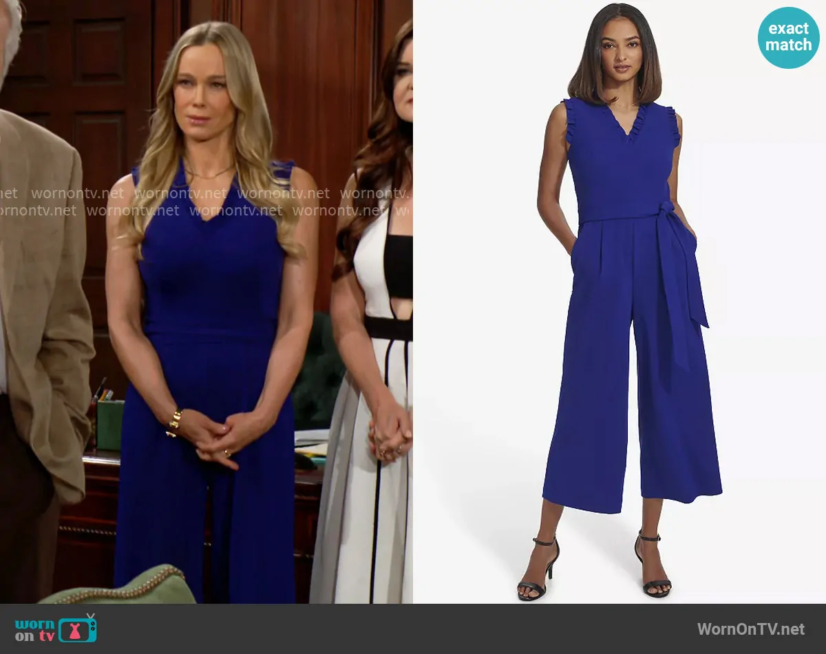 Donna Logan (played by Jennifer Gareis) on The Bold and the Beautiful on CBS was spotted wearing this blue v-neck jumpsuit on The Bold and the Beautiful on Aug 13 2025's episode. Donna's Jumpsuit is the Ruffle Jumpsuit by Andrew Marc.