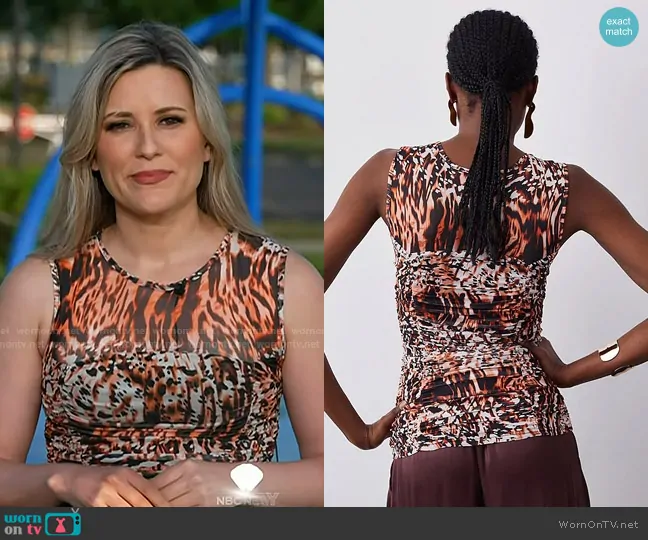 on Today on NBC was spotted wearing this animal print sleeveless top on Today on Aug 13 2025's episode. 's Top is the Leopard Print Mesh Ruched Jersey Top by Karen Millen .