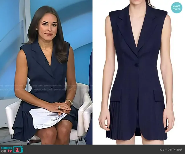 Kaylee Hartung on Today on NBC was spotted wearing this navy pleated blazer dress on Today on Aug 14 2025's episode. Kaylee's Dress is the Carine Sleeveless Blazer Mini Dress in Deep Blue by Sandro.