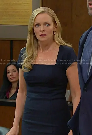 Belle Brady (played by Martha Madison) on Days of our Lives on Peacock was spotted wearing this navy square neck dress on Days of our Lives on Aug 12 2025's episode. Belle's Dress is the Haisley Dress in Navy by Reiss . Belle's Bag is the Top Handle Bag in Black by Topshop.