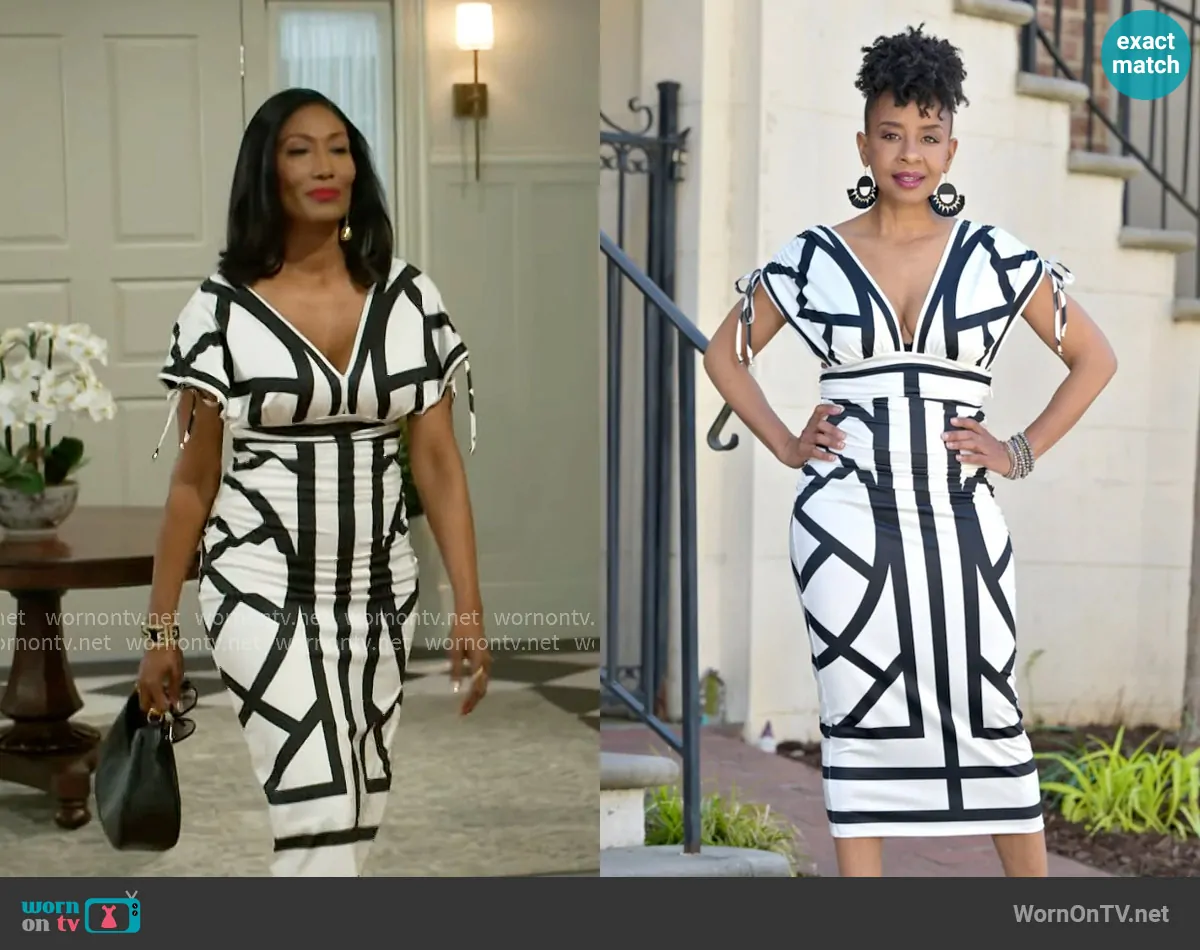 Dana 'Leslie' Thomas (played by Trisha Mann-Grant) on Beyond the Gates on CBS was spotted wearing this black and white printed dress on Beyond the Gates on Aug 19 2025's episode. Leslie's Dress is the Abstract Plunging Neckline Midi Dress from Pink Sky Boutique.