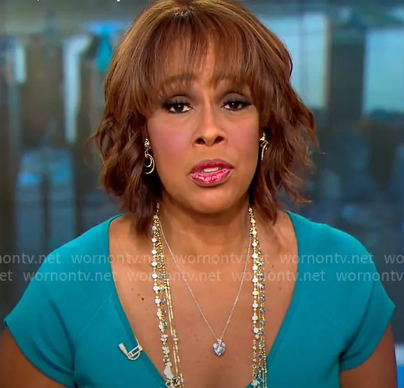 Gayle King on CBS Mornings on CBS was spotted wearing this teal v-neck dress on CBS Mornings on Mar 28 2019's episode. Gayle's Dress is the Silk Jersey Bodycon Dress by Narciso Rodriguez .