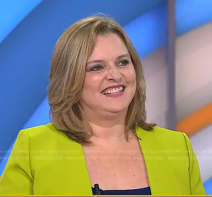 on Today on NBC was spotted wearing this yellow open jacket on Today on Aug 20 2025's episode. 's Jacket is the Elle Jacket in Kiwi by Kasper.