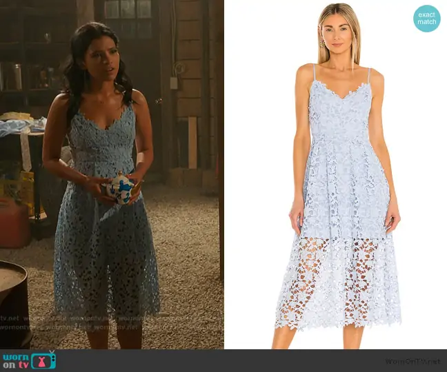 Jackie Howard (played by Nikki Rodriguez) on My Life with the Walter Boys on Netflix was spotted wearing this blue lace dress on My Life with the Walter Boys on episode 'Happily Ever After' (1x10) in Dec 2023. Jackie's Dress is the Lace A-Line Midi Dress by ASTR the Label.
