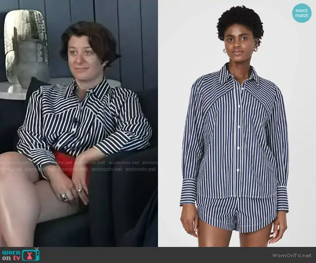 on Today on NBC was spotted wearing this blue striped shirt on Today on Aug 21 2025's episode. 's Top is the Alexis Cotton Angled-Yoke Shirt in Marine/Summer White by French Connection.