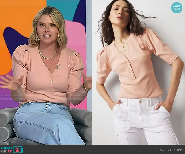 Jenna Bush Hager on Today on NBC was spotted wearing this pink puff sleeve top on Today on Aug 21 2025's episode. Jenna's Top is the Ribbed Stretch Henley Top in Bisou by White House Black Market.