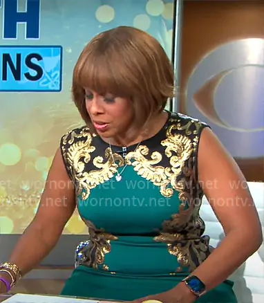 Gayle King on CBS Mornings on CBS was spotted wearing this green and gold dress on CBS Mornings on Jan 01 2020's episode. Gayle's Dress is the Milana Dress by Tadashi Shoji .