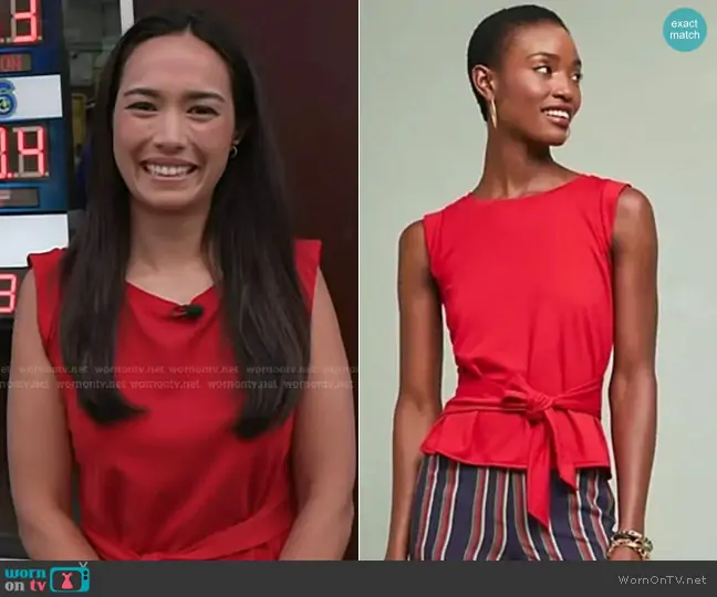 Emilie Ikeda on Today on NBC was spotted wearing this red tie waist top on Today on Aug 25 2025's episode. Emilie's Top is the Peekaboo-Back Tie-Waist Sleeveless Top in Red by Maeve.