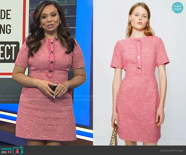 Adelle Caballero on Today on NBC was spotted wearing this pink tweed dress on Today on Aug 25 2025's episode. Adelle's Dress is the Dr. Varley Tweed Mini Dress by LK Bennett.