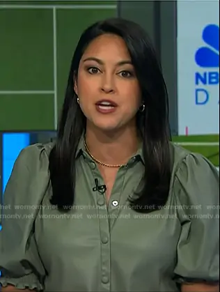 on NBC News Daily on NBC was spotted wearing this green puff sleeve top on NBC News Daily on Aug 25 2025's episode. 's Top is the Puff-Sleeve Faux Leather Blouse in Green by Dolan Left Coast.