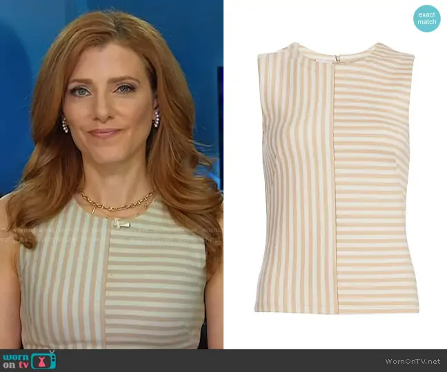 on NBC News Daily on NBC was spotted wearing this beige striped top on NBC News Daily on Aug 25 2025's episode. 's Top is the Patchwork Stripe Sleeveless Top in Desert Sand by Akris Punto.
