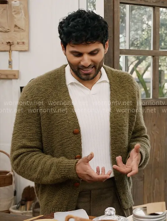 Jay Shetty on With Love Meghan on Netflix was spotted wearing this green cardigan on With Love Meghan on episode 'Spice Up Your Life' (2x05) in Aug 2025. 's Sweater is the Gnifetti Cardigan by Loro Piana.
