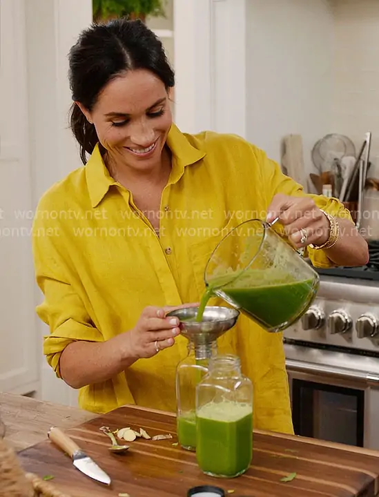 Meghan Markle on With Love Meghan on Netflix was spotted wearing this yellow linen tunic shirt on With Love Meghan on episode 'Just For The Halibut' (2x06) in Aug 2025. Meghan's Top is the JJ Shirt in Jaune Linen by Heidi Merrick.